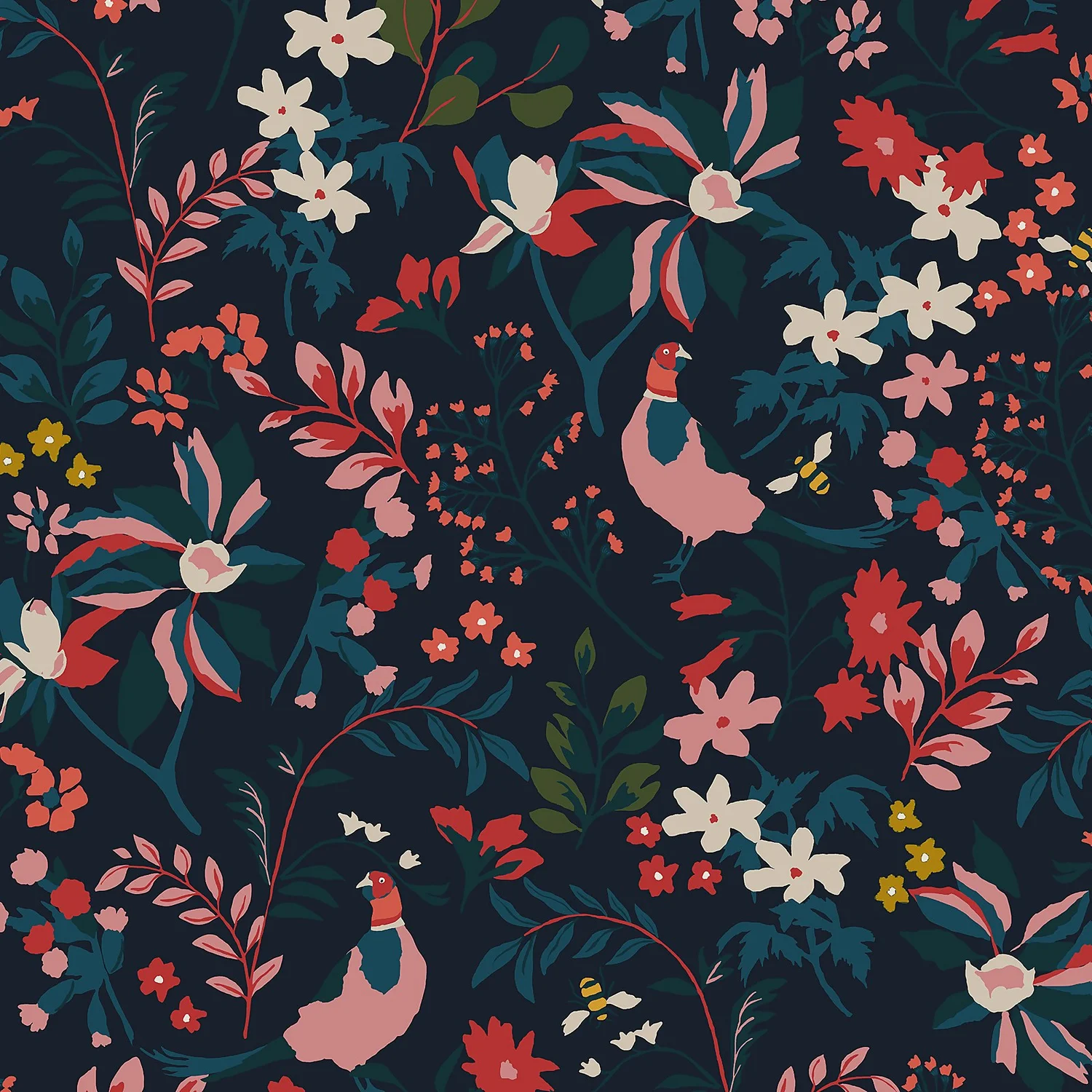 Bring a classic heritage look to your home and showcase nature at its most contemporary. This stunning design combines crisp, modern foliage, sprigs and flowers intertwined with characterful pheasants and bees. Perfect for bringing the outside in, this charming wallpaper design has a fun colour palette of pinks, reds and teals beautifully contrasted on a French navy background. This wallpaper is also paste the wall, making it easy to hang.