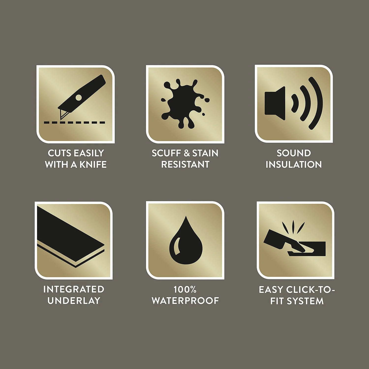 100% waterproof luxury vinyl tile with integral underlay and Tough Core Technology with a natural texture. With its dark and affluent tones, this floor emulates luxury and is ideal for use throughout the house in all living spaces . Cuts easily with a knife to install quickly and simply with the click system. Provides an easy clean flooring solution, resistant to scuffs and stains.